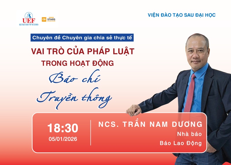 Trong bối cảnh kỷ nguyên số và sự bùng nổ thông tin đa chiều, việc nắm vững hành lang pháp lý không chỉ là yêu cầu bắt buộc mà còn là nền tảng cốt lõi để hoạt động báo chí - truyền thông phát triển bền vững. Nhằm trang bị tư duy chuyên sâu cho học viên, tối ngày 05/01/2026, Viện Đào tạo sau đại học UEF sẽ tổ chức chuyên đề chuyên gia với chủ đề: “Vai trò của pháp luật trong hoạt động báo chí truyền thông”.