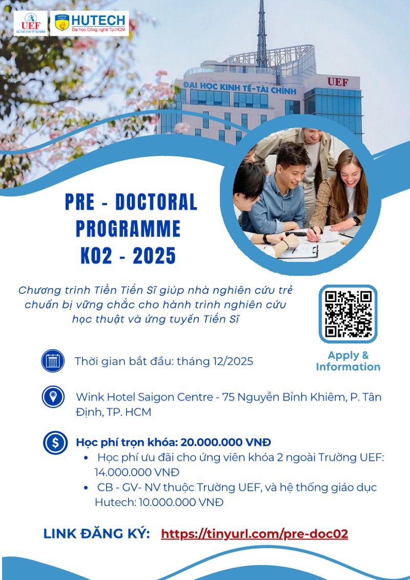 Tiếp nối thành công của Đợt 1 (2025), Trường Đại học Kinh tế – Tài chính TP.HCM (UEF) triển khai chương trình Tiền Tiến sĩ (Pre-Doctoral Programme) đợt 2 - 2025. Chương trình được thiết kế chuyên biệt nhằm nâng cao năng lực nghiên cứu độc lập, phát triển kỹ năng viết và công bố bài báo trên các tạp chí khoa học uy tín. Đây là cơ hội để đội ngũ nghiên cứu trẻ xây dựng nền tảng học thuật vững chắc trên con đường theo đuổi học vị Tiến sĩ trong và ngoài nước.