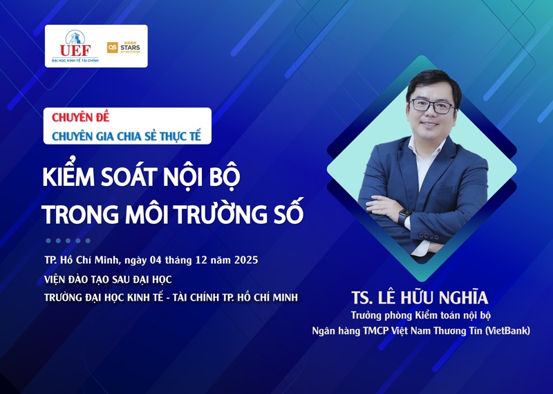 Tối ngày 04/12/2025 sắp tới, Viện Đào tạo sau đại học UEF sẽ tổ chức chuyên đề thực tiễn với chủ đề “Kiểm soát nội bộ trong môi trường số”, do TS. Lê Hữu Nghĩa, Trưởng phòng Kiểm toán nội bộ Ngân hàng TMCP Việt Nam Thương Tín (VietBank), trực tiếp chia sẻ.
