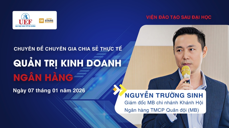 Nhằm mang đến góc nhìn thực tiễn và chuyên sâu về chủ đề "Quản trị kinh doanh ngân hàng", Viện Đào tạo sau đại học UEF sẽ tổ chức buổi chuyên đề học thuật đặc biệt vào tối ngày 07/01. Chuyên đề được thiết kế dành riêng cho học viên chương trình Thạc sĩ ngành Tài chính – Ngân hàng, với sự dẫn dắt và chia sẻ chuyên môn từ chuyên gia đến từ Ngân hàng Quân đội (MB Bank).