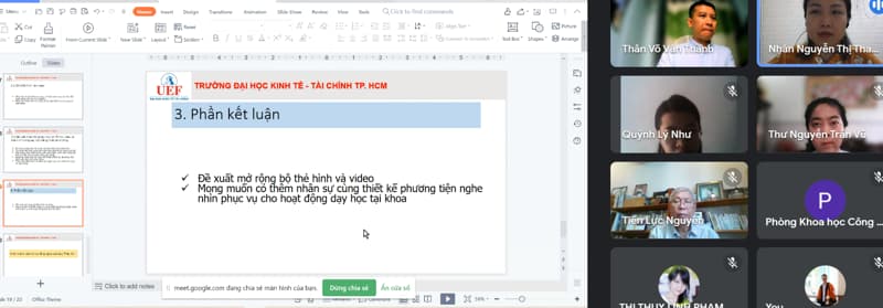 Sau khi nghe trình bày, các thành viên trong hội đồng đã đưa ra ý kiến phản biện và các câu hỏi về đề tài cho tác giả. Nhìn chung, đề tài đáp ứng được mục tiêu của một bài nghiên cứu khoa học giảng viên, có tính ứng dụng cao, phù hợp với thực tiễn giảng dạy Ngôn ngữ Nhật tại UEF. Tuy nhiên, hội đồng cũng đưa ra một số góp ý để đề tài được hoàn thiện hơn như: làm rõ thêm khung lý thuyết, tăng số lượng sinh viên được phỏng vấn,... đặc biệt là vấn đề về bản quyền hình ảnh, âm thanh; phi chí in ấn, kích thước bộ hình ảnh,…