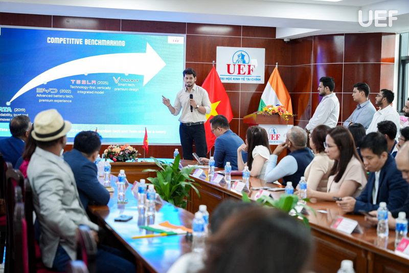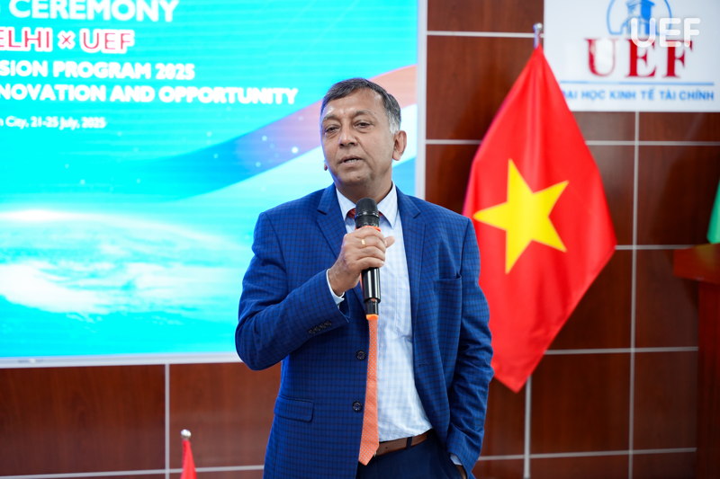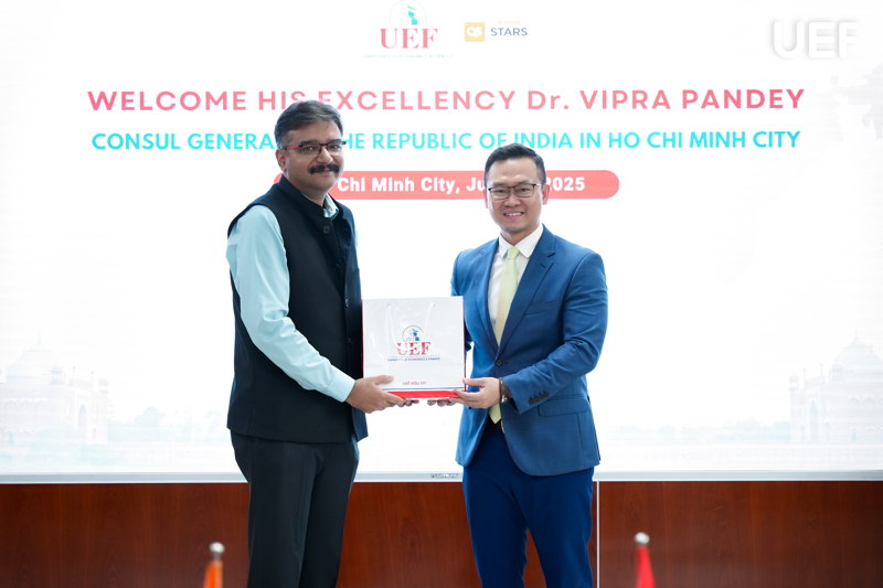 Chiều cùng ngày, UEF tổ chức lễ tổng kết nhằm ghi nhận và chúc mừng đoàn học viên FIIB đã hoàn thành xuất sắc chương trình giao lưu quốc tế 2025. Buổi lễ có sự tham dự của ông Vipra Pandey - Tổng Lãnh sự Ấn Độ tại TP.HCM, cùng đại diện Lãnh sự quán, đại diện Trường Đại học Công nghệ TP.HCM (HUTECH), lãnh đạo UEF và toàn thể học viên, sinh viên hai trường.
