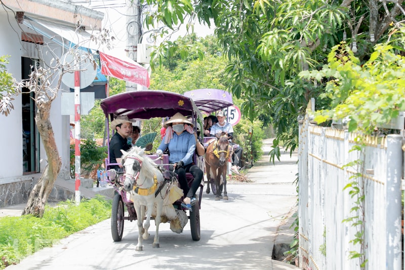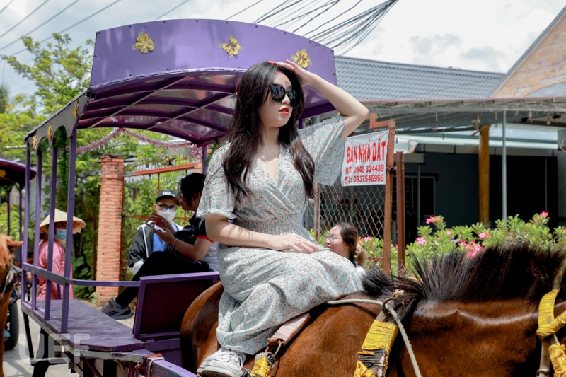 Trên hành trình di chuyển đến Cồn Phụng, đoàn sinh viên đã có giây phút sảng khoái cùng bạn bè trên những chiếc xe ngựa