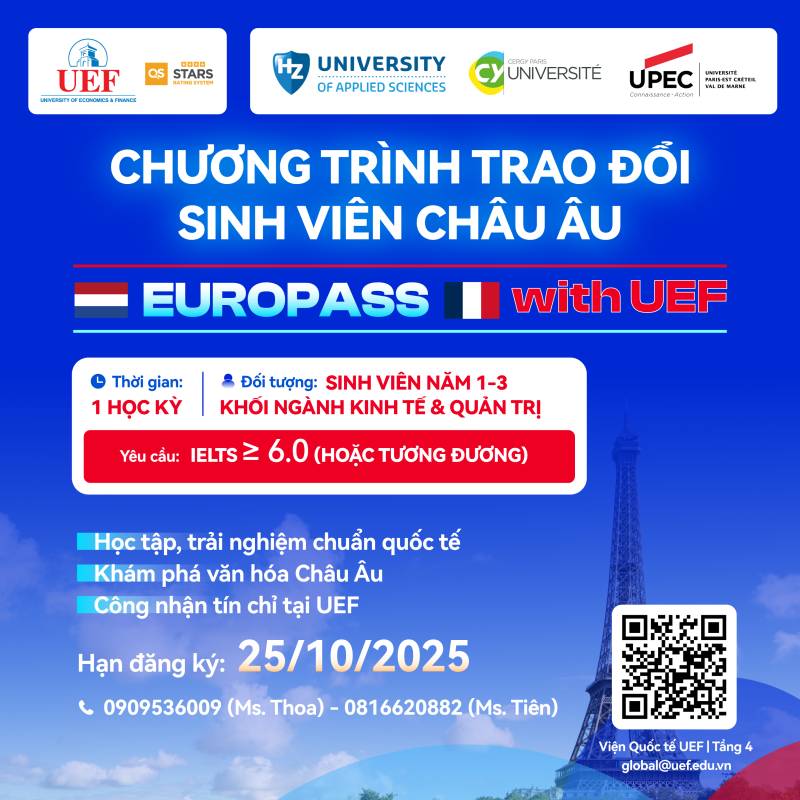 Với mục tiêu mở rộng cơ hội học tập quốc tế và giúp sinh viên tiếp cận nền giáo dục tiên tiến tại châu Âu, Viện Quốc tế – Trường Đại học Kinh tế - Tài chính TP.HCM (UEF) chính thức triển khai chương trình trao đổi sinh viên tại châu Âu năm học 2025 – 2026. Đây là cơ hội để UEFers được trải nghiệm môi trường học tập hiện đại, giao lưu văn hóa và nâng cao năng lực toàn cầu trong thời đại hội nhập.