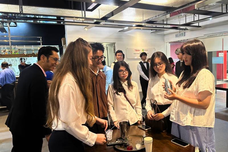 Trong phần thực hành, sinh viên được chia thành hai nhóm để học pha chế và chế biến món ăn bản địa, dưới sự hướng dẫn trực tiếp của giảng viên INTI. Kết thúc buổi học, các bạn được cấp chứng chỉ tham gia workshop, đánh dấu một trải nghiệm chuyên môn đáng nhớ trong hành trình học tập quốc tế.
