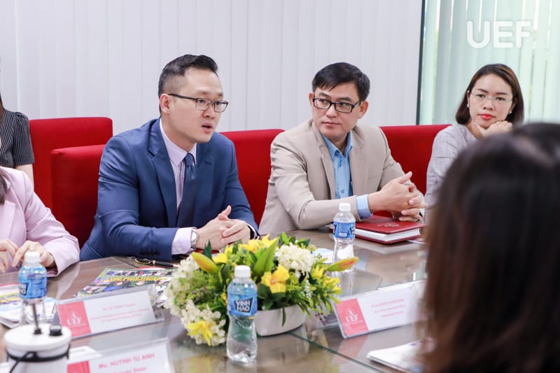 Đại diện UEF trong các buổi làm việc có TS. Đỗ Hữu Nguyên Lộc - Phó Hiệu trưởng, TS. Nhan Cẩm Trí - Phó Hiệu trưởng, TS. Lý Thiên Trang - Giám đốc Bảo đảm và kiểm định chất lượng, TS. Mạch Trần Huy - Phó Chánh Văn phòng trường, Giám đốc nhân sự cùng đại diện lãnh đạo Khoa Ngôn ngữ và Văn hóa quốc tế, Khoa Tài chính - Kế toán, Khoa Tiếng Anh, Khoa Marketing.