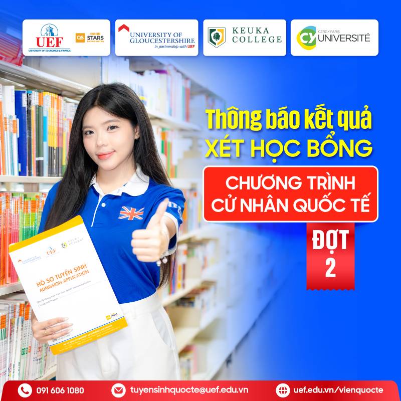 Sau thời gian nhận hồ sơ xét học bổng đợt 2 (từ ngày 01/01 - 31/03/2026), Viện Quốc tế UEF công bố kết quả học bổng chương trình liên kết đào tạo Cử nhân Anh Quốc (ĐH Gloucestershire) Cử nhân Hoa Kỳ (ĐH Keuka) và Cử nhân Pháp (ĐH CY Cergy Paris).