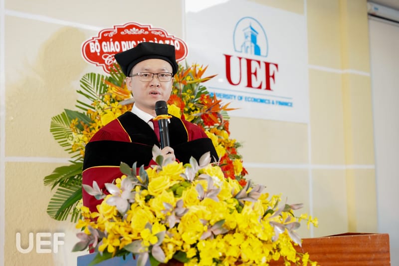 Trong không khí trang trọng, TS. Đỗ Hữu Nguyên Lộc đại diện Ban Giám hiệu và Viện Quốc tế gửi lời chúc mừng đến các bạn tân Cử nhân chương trình liên kết với UoG và LTU: “Chào mừng các bạn đến với Lễ Tốt nghiệp chương trình Cử nhân Anh Quốc 2023 tại UEF. Tôi rất hạnh phúc khi được chúc mừng tất cả sinh viên tốt nghiệp ngày hôm nay. Đây là một ngày quan trọng, không chỉ là thời điểm để chúc mừng các bạn được tốt nghiệp, mà còn là dịp để nhìn lại thời gian đã qua, suy nghĩ đến cơ hội và thách thức sắp tới. UEF, UoG và LTU tự hào về các bạn, chúng tôi chúc các bạn thành công trên chặng đường sắp tới của mình”.