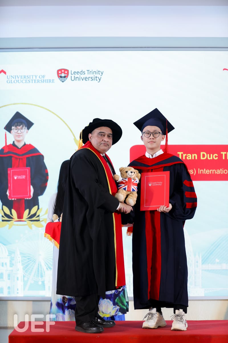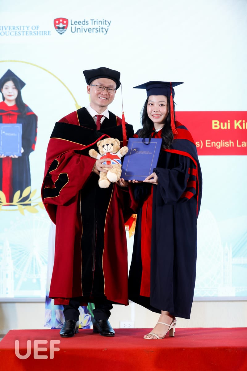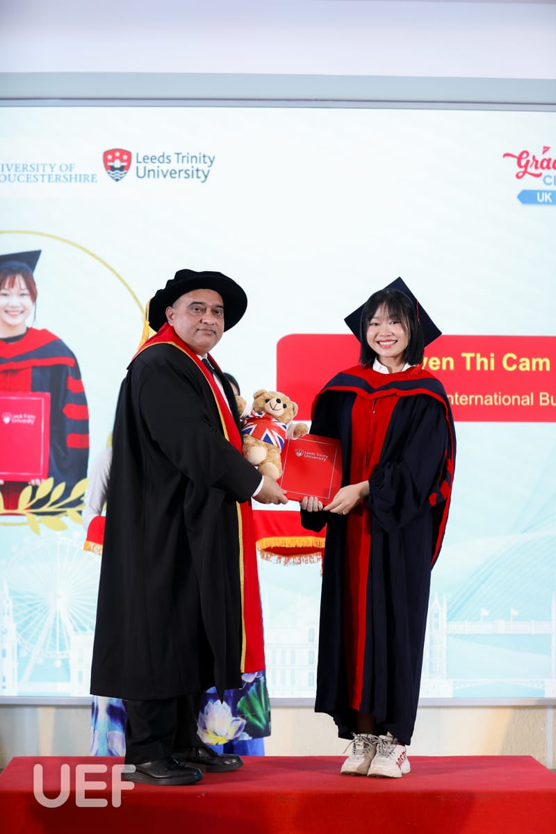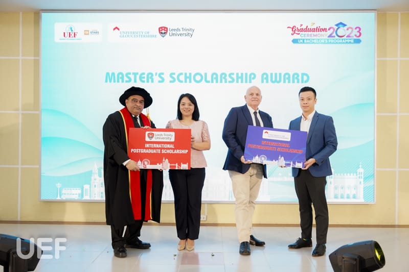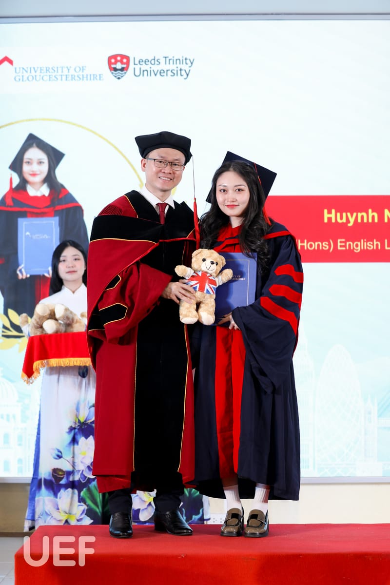 Trong buổi lễ tốt nghiệp ý nghĩa này, các tân cử nhân sẽ chính thức cầm trên tay tấm bằng quốc tế danh giá. Trong số đó, 3 gương mặt với thành tích học tập tốt, điểm số tích lũy trung bình thuộc top đầu cũng được vinh danh. Chương trình liên kết quốc tế chúc mừng 3 tân Thủ khoa: Nguyễn Lâm Hồng Giao - tân Thủ khoa ngành Kinh doanh quốc tế, chương trình liên kết Đại học Leeds Trinity; Giang Ngọc Anh - tân Thủ khoa ngành Quản trị kinh doanh và Marketing, chương trình liên kết Đại học Gloucestershire; Lê Quốc Vương - tân Thủ khoa ngành Tiếng Anh và Ngôn ngữ học, chương trình liên kết Đại học Gloucestershire. Bên cạnh đó, Viện Quốc tế UEF cũng nhận được học bổng thạc sĩ do đại diện UoG và LTU trao tặng.