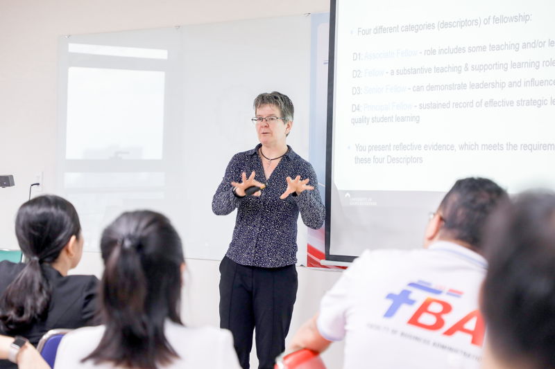 Liên tiếp trong ba ngày 14, 15 và 16/11, Viện Quốc tế và Văn phòng trường đã phối hợp tổ chức thành công chương trình tập huấn phương pháp giảng dạy đại học theo chuẩn quốc tế với chủ đề "Advanced Higher Education Fellowship Scheme". Đây là cơ hội để các thầy, cô tiếp cận với học bổng Advance Higher Education của Anh quốc. Đồng thời, các cán bộ, giảng viên tham gia tập huấn còn được học hỏi nhiều phương pháp dạy học mới đầy thú vị và hữu ích từ các chuyên gia đến từ trường Đại học Gloucestershire (UoG), Vương quốc Anh.