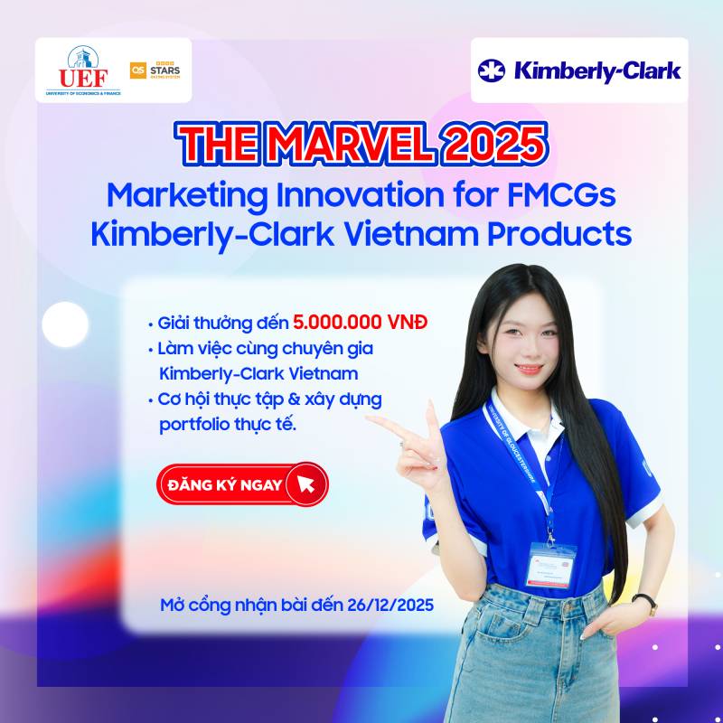 The MARVEL 2025 là cuộc thi học thuật dành cho sinh viên UEF mong muốn thử sức với bài toán Marketing thực tế từ Kimberly-Clark Vietnam – doanh nghiệp FMCG quốc tế sở hữu thương hiệu Kotex. Cuộc thi tập trung vào việc xây dựng các giải pháp sáng tạo hướng đến người dùng Gen Z trên nền tảng số, đặc biệt là TikTok. Đây là cơ hội để sinh viên áp dụng kiến thức đã học, phát triển kỹ năng thực chiến và làm việc trực tiếp với chuyên gia doanh nghiệp.