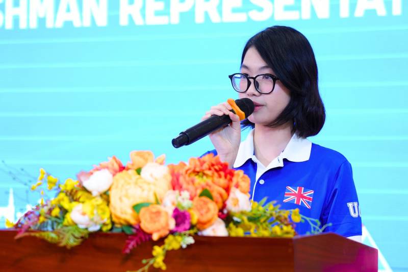 Đại diện cho tân sinh viên khóa 2025 – 2026, bạn Lê Phương Hồng Anh, sinh viên ngành Truyền thông đa phương tiện - Gloucestershire Vietnam chia sẻ: “Ba năm phổ thông, em từng rất nhút nhát, luôn né tránh và nghi ngờ khả năng của bản thân. Nhưng khi đến với Gloucestershire Vietnam, em đã tìm thấy bước ngoặt. Chỉ sau một tuần nhập học, em đã có những trải nghiệm đáng nhớ, mạnh dạn tham gia hoạt động, kết nối bạn bè và đặc biệt là vượt qua nỗi sợ để đứng trên sân khấu hôm nay. Em tin rằng, mỗi bạn tân sinh viên đều mang trong mình những lo lắng, nhưng nếu kiên trì và có mục tiêu rõ ràng, chúng ta sẽ biến nỗi sợ thành dũng khí, biến hoài nghi thành chiến thắng. Em hy vọng rằng tất cả chúng ta sẽ cùng nhau viết nên hành trình đại học rực rỡ và ý nghĩa tại Gloucestershire Vietnam.”
