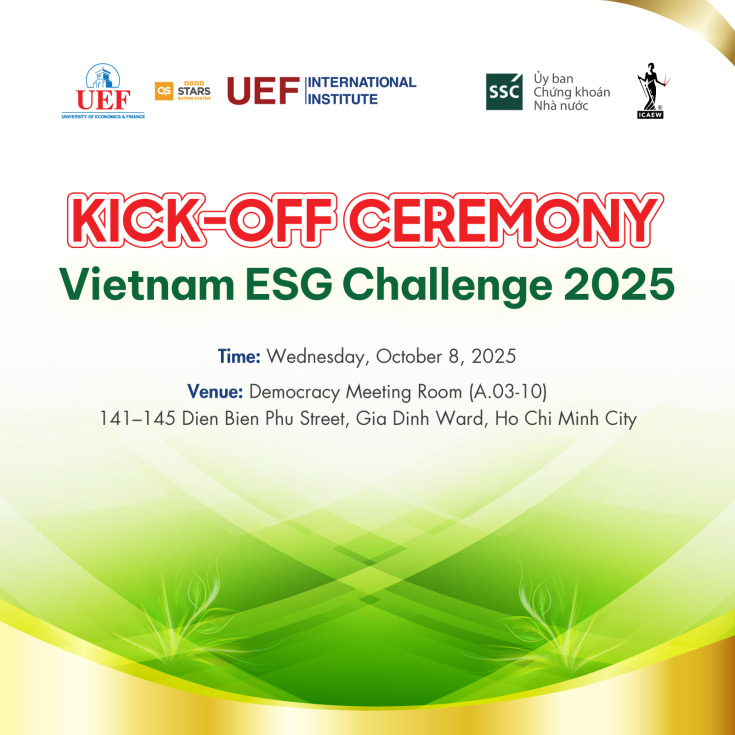 Viện Quốc tế UEF kính mời quý thầy cô, các bạn sinh viên trong danh sách Top 30 cùng cũng như các sinh viên quan tâm đến lĩnh vực ESG đến tham dự buổi Lễ Kick-off để cùng khởi động một hành trình học thuật đầy cảm hứng và ý nghĩa!