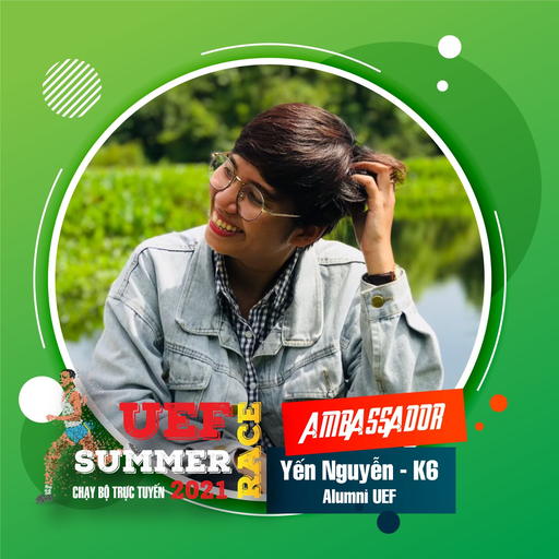 Yến cảm thấy rất vui khi được tham gia vào giải chạy bộ online UEF Summer Race 2021, đặc biệt hơn với tư cách là một cựu sinh viên của trường UEF. Từ một người chạy chưa đến 100m cho đến hoàn thành được các cự ly 5km, 10km hay 21km, mình hiểu được việc tập luyện thể thao quan trọng như thế nào. Ngoài việc bảo vệ sức khỏe, chạy bộ là môn thể thao giúp bạn rèn luyện được kỷ luật và sự kiên trì hơn bất kể môn thể thao nào khác. Yến tin rằng, khi tham gia UEF Summer Race 2021, mỗi bước chạy của chúng ta là một sự kết nối và tạo ra giá trị cho xã hội”.
