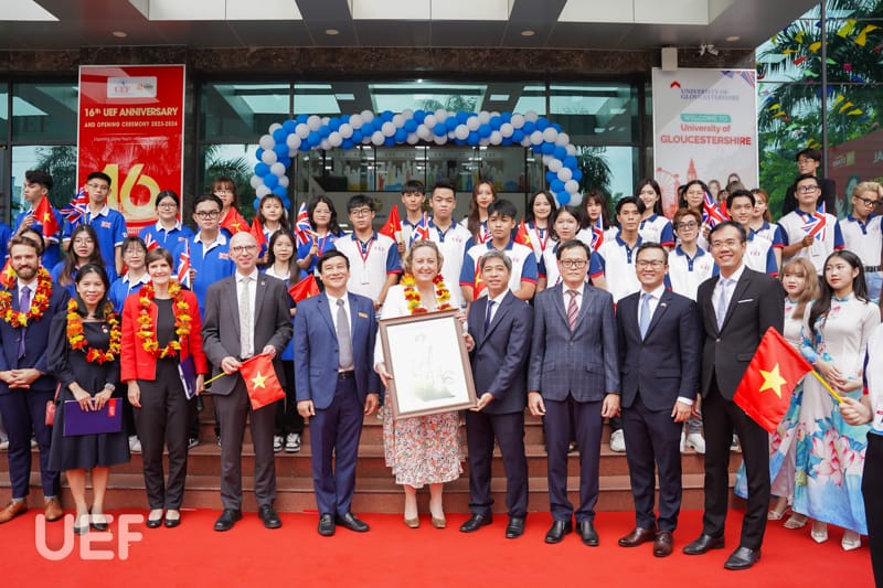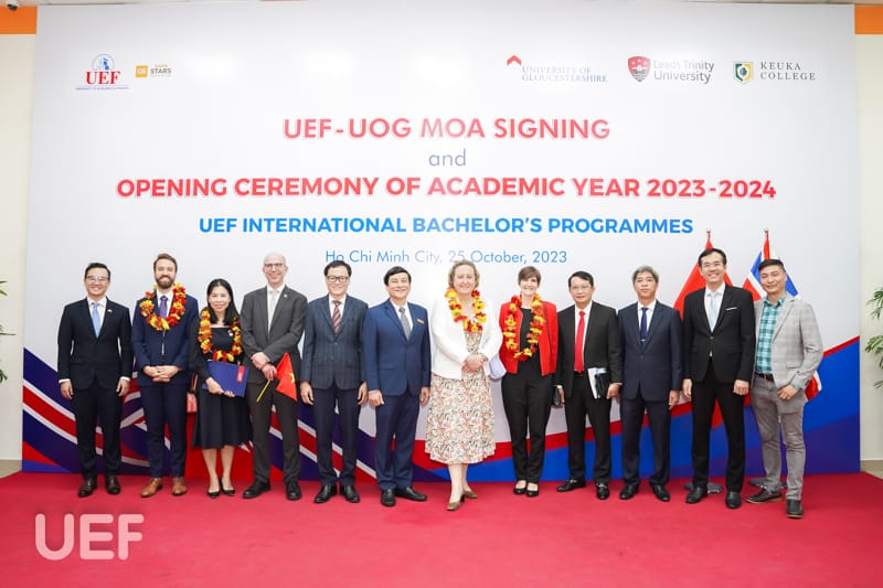 Nhân chuyến thăm và làm việc tại Việt Nam, chiều 25/10, Trường Đại học Kinh tế - Tài chính TP.HCM (UEF) vinh dự đón tiếp bà Anne - Marie Trevelyan, Quốc vụ khanh Bộ Ngoại giao Anh phụ trách khu vực Ấn Độ Dương - Thái Bình Dương cùng các đại diện của Lãnh sự quán Anh tại TP.HCM đến tham quan trường, chúc mừng lễ ký kết MOA giữa Đại học Gloucestershire - UoG (Vương quốc Anh) và UEF; Lễ khai giảng chương trình Cử nhân quốc tế năm học 2023 - 2024.