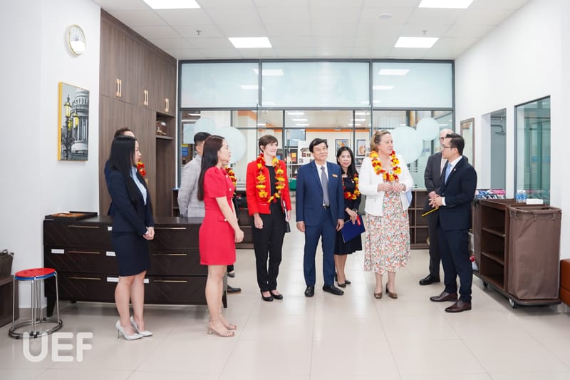 Trong chuyến thăm UEF hôm nay, bà Anne-Marie Trevelyan cùng đoàn Lãnh sự quán Anh cũng đã tham quan cơ sở vật chất, môi trường học tập của sinh viên chương trình hợp tác quốc tế giữa UEF và UoG.