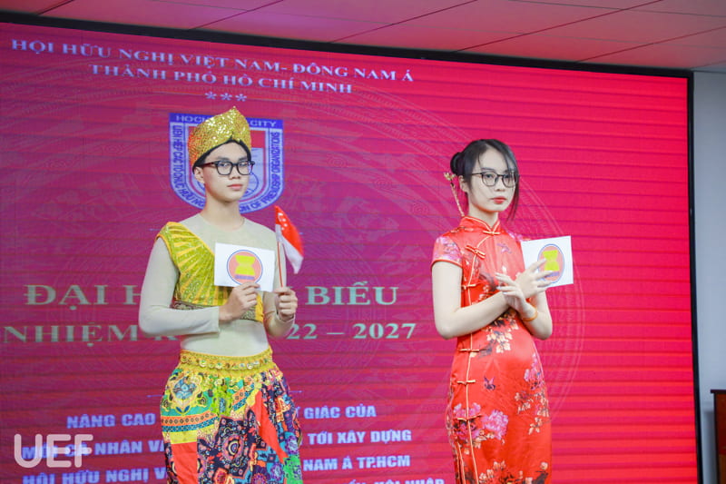 Đáng chú ý, các bạn sinh viên UEF tham dự Đại hội đã trình diễn trang phục dân tộc các nước, kèm theo phần giới thiệu sơ lược thông tin về các quốc gia ASEAN bằng tiếng Anh, tự tin thể hiện khả năng ngoại ngữ của mình trước quan khách quốc tế. Các bạn nhận được sự hưởng ứng và yêu thích từ đại diện các Tổng Lãnh sự quán các quốc gia ASEAN tham dự chương trình Đại hội.