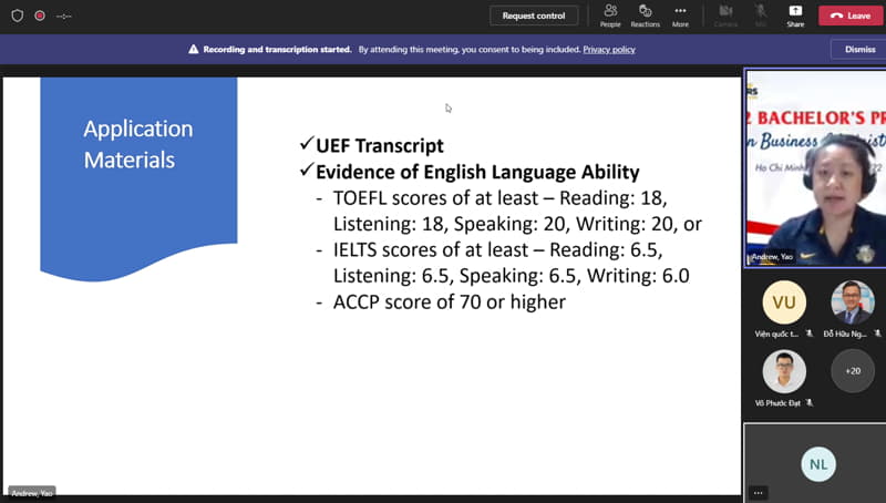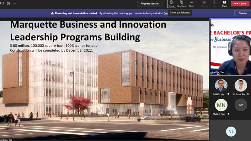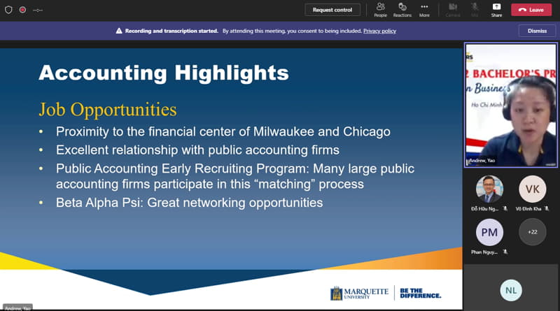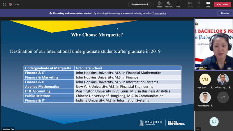 Tại chương trình, cô Yao Andrew đã giới thiệu thông tin về Đại học Marquette nói chung và chia sẻ chi tiết về các vấn đề liên quan đến chương trình 2+2 như điều kiện chuyển tiếp, hồ sơ, chính sách học bổng, lộ trình đào tạo, chương trình thực tập, cơ hội việc làm.