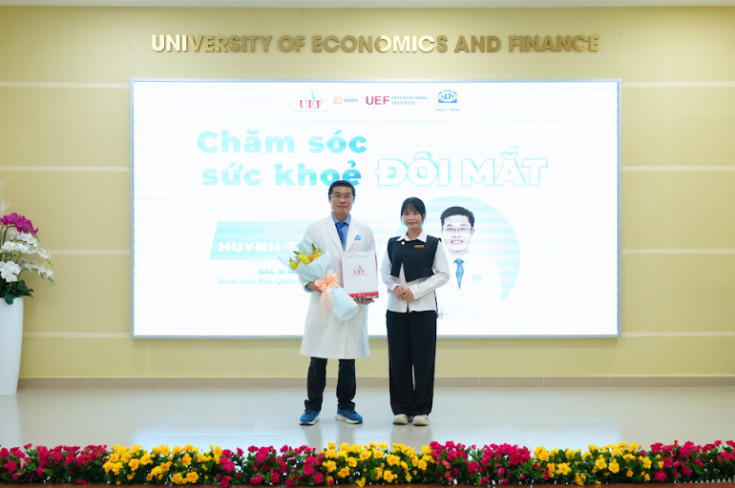 Tham dự sự kiện có sự hiện diện của ThS. Phan Lý Nguyên Trinh - Tổ trưởng Viện Quốc Tế UEF, Thạc sĩ Bác sĩ Huỳnh Tuấn Kiệt – Bác sĩ Nhãn khoa, chuyên gia điều trị các bệnh lý về mắt và phẫu thuật Đáy mắt tại Bệnh viện Mắt Quốc tế Việt - Nga TPHCM cùng với các bạn sinh viên của trường.