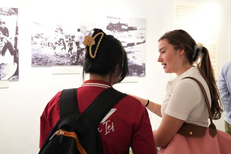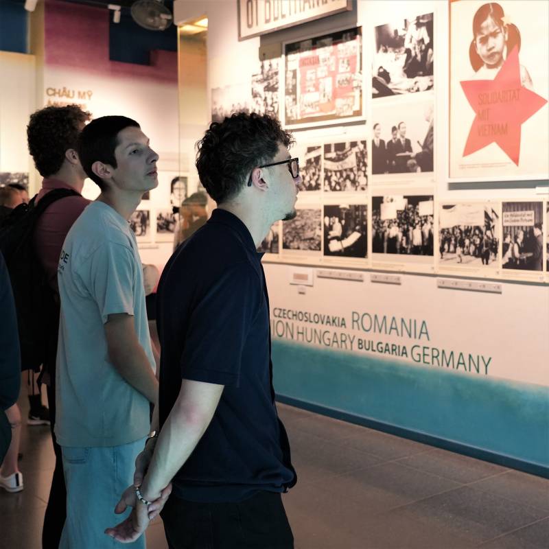 Tiếp nối hành trình, đoàn sinh viên đến Bảo tàng Chứng tích Chiến tranh, nơi lưu giữ những tư liệu, hình ảnh và hiện vật phản ánh chân thực hậu quả của chiến tranh. Thông qua các câu chuyện tại bảo tàng, các bạn có cơ hội tìm hiểu về những tổn thất mà Việt Nam đã trải qua, từ đó cảm nhận sâu sắc hơn về giá trị của hòa bình và tinh thần kiên cường của dân tộc Việt Nam.